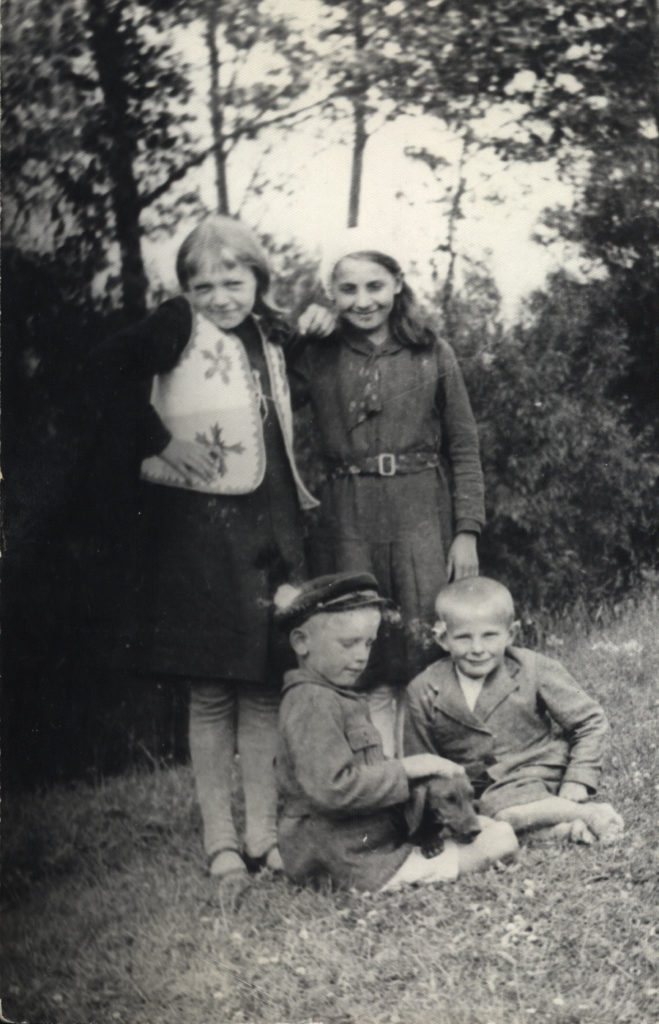 Dziewczynka w białej kamizelce to Stefania Duniec, chłopczyk w czapce głaszczący psa to jej brat Seweryn Duniec. Drugi chłopczyk siedzący to Formicki St (-anisław? -efan?