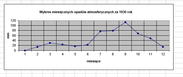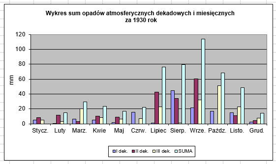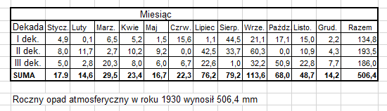 Zestawienie opadów atmosferycznych dekadowych i miesięcznych za rok 1930 w Radziemicach. Opracowano na podstawie danych z punktu obserwacyjnego w Radziemicach.
